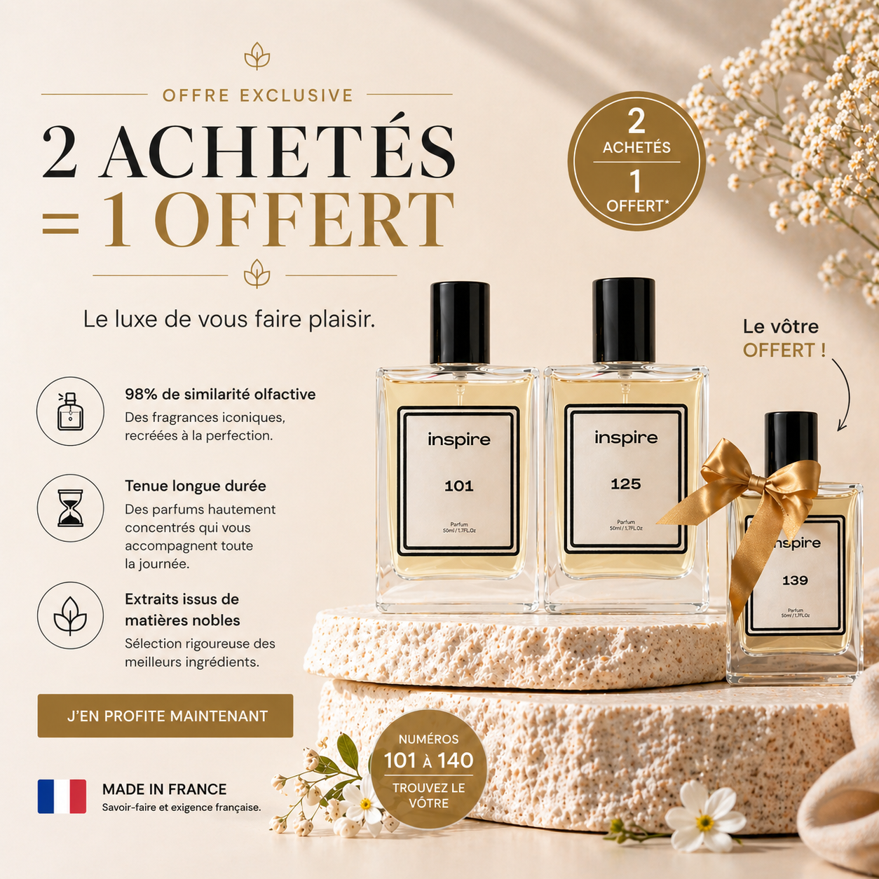 Chez Inspire, nous sommes convaincus que l’essayer, c’est l’adopter. Nos parfums sont conçus avec une concentration ultra-élevée et une fidélité olfactive exceptionnelle pour vous offrir une expérience digne des plus grandes maisons de luxe. Fabriqués en France, ils allient savoir-faire et excellence. Commandez en toute confiance et laissez-vous surprendre par la qualité !