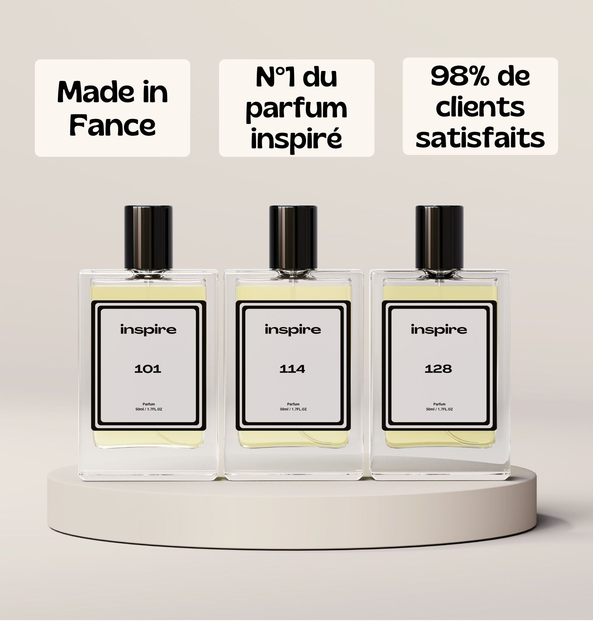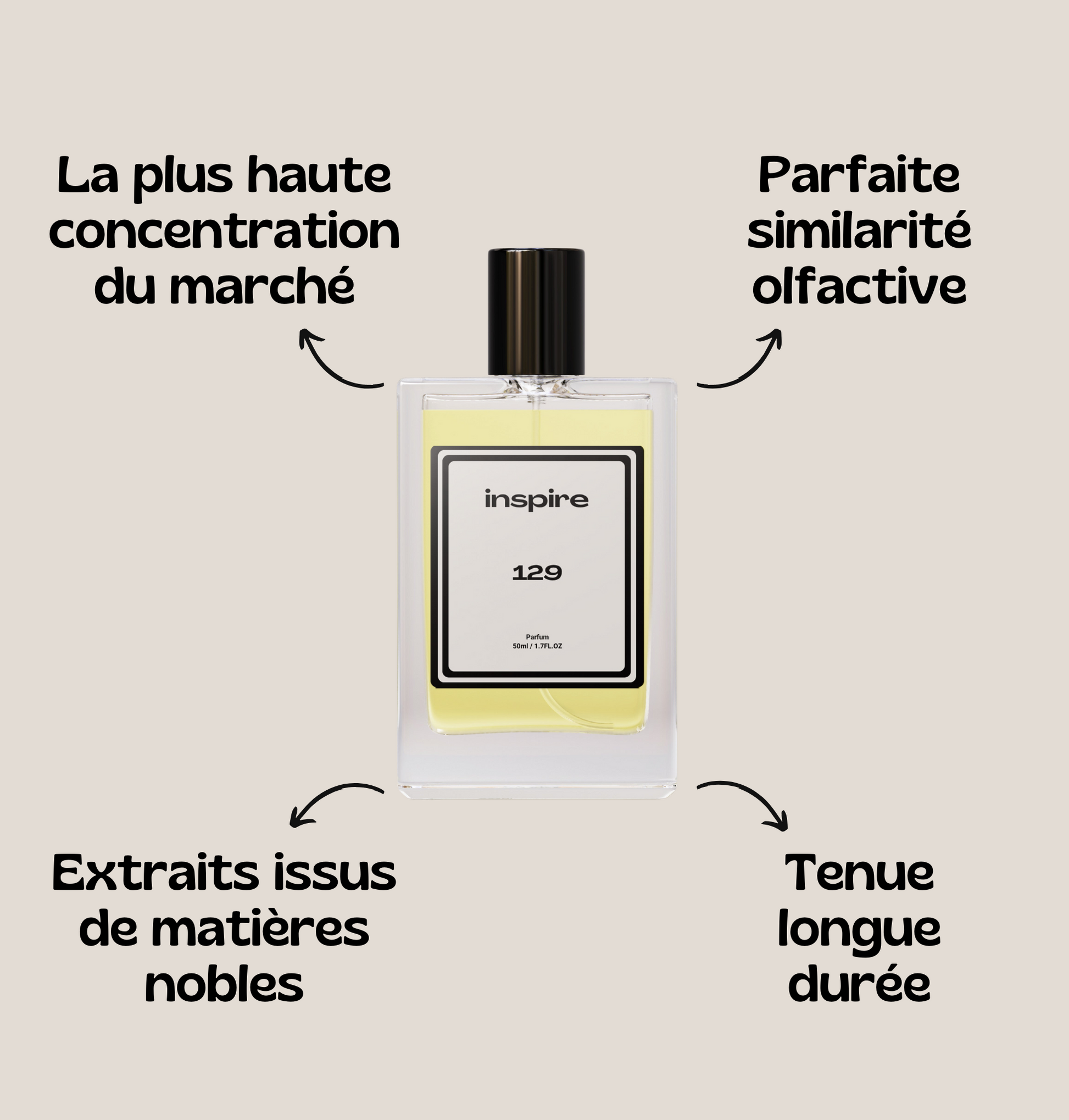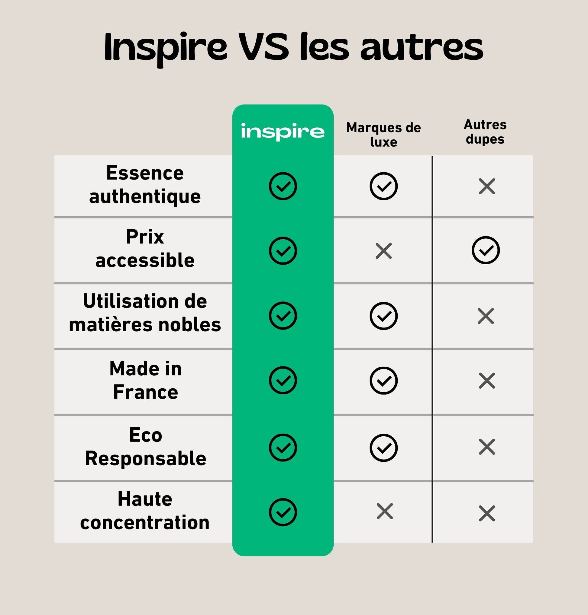 Inspire Parfums est aujourd’hui la marque d’inspiration la plus concentrée du marché, avec 25% de concentré de parfum. À titre de comparaison, la majorité des marques d'inspirations utilisent seulement 6 à 12 %, et même certaines grandes maisons se limitent à des Eaux de Parfum, alors que nous formulons nos créations en Extrait de Parfum pour une intensité et une tenue incomparables.